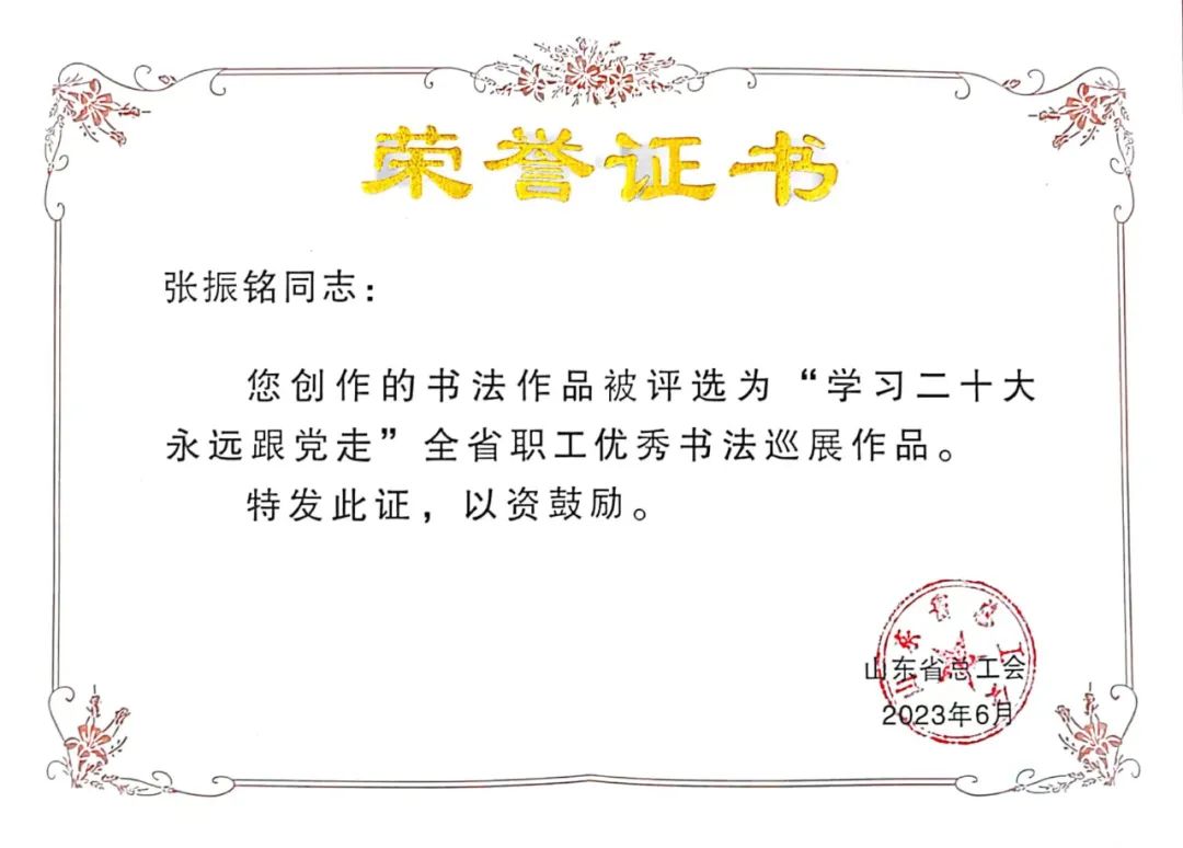奧翔公司員工張振銘書法作品被評為全省職工優秀書法巡展作品