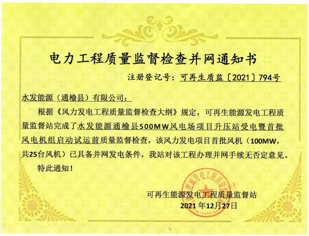 水發能源通榆縣500MW風電場項目獲得首批風機電力工程質量監督檢查并網通知書